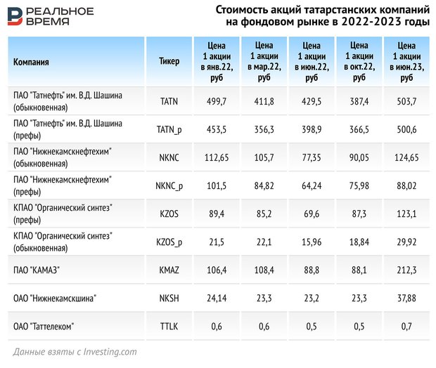 Рост показали и акции других татарстанских компаний. Рост обыкновенных акций ПАО «Нижнекамскнефтехим» к январю 2022 года составил более 10% — стоимость одной обыкновенной акции выросла со 112,65 в январе 2022 года до 124,65 рубля в июне 2023-го.