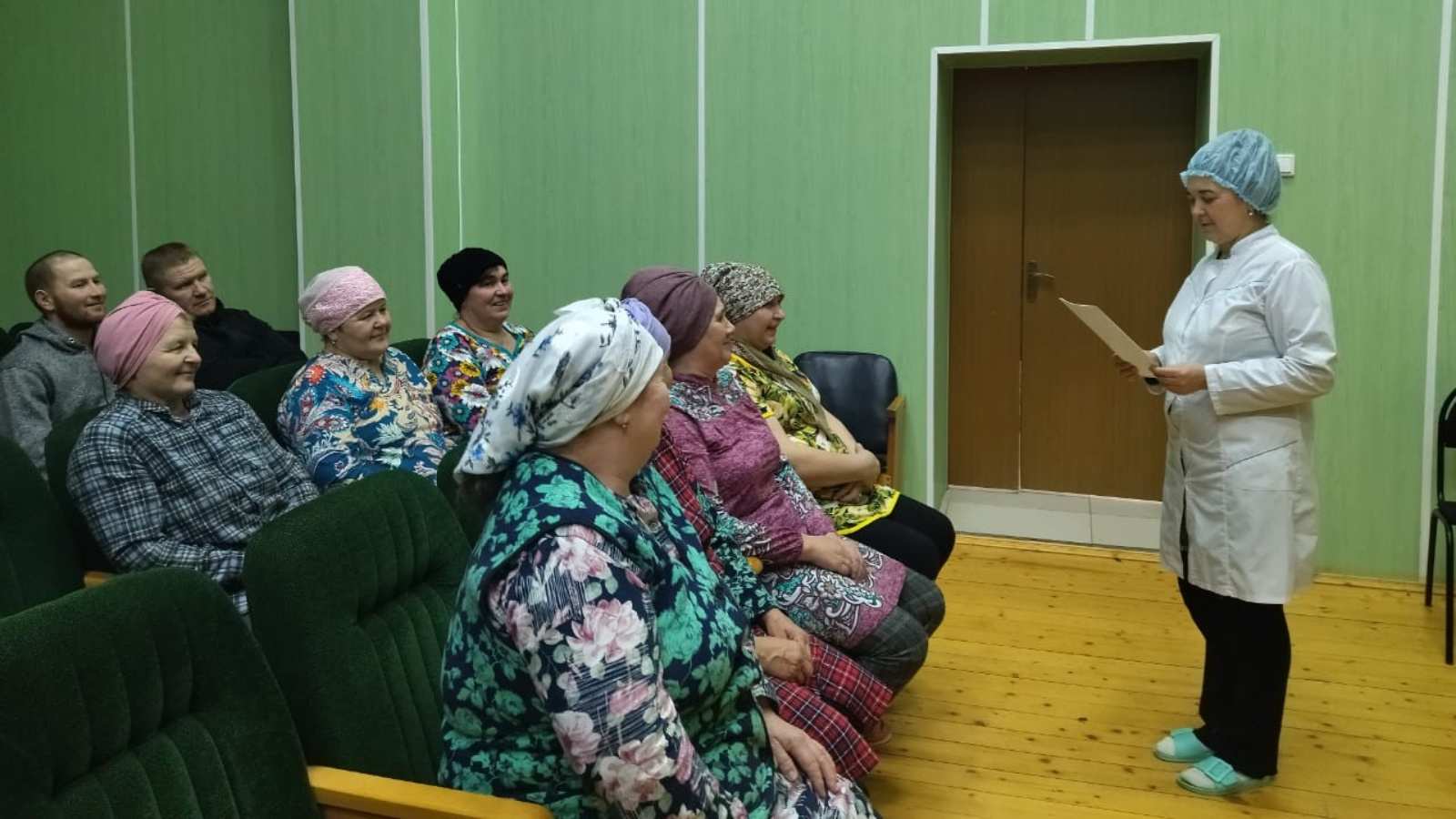 На фото фельдшер Старомичанского ФАП Загидуллина М.И. проводит санитарно-просветительную беседу с населением на тему правильное питание залог здоровья.
