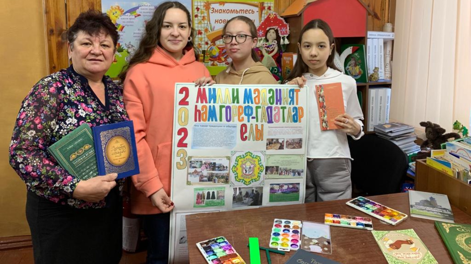 В рамках года национальных культур и традиций в республике Татарстан Большеныртинская сельская библиотека с молодежью села оформили информационный уголок «Многоцветие татарской культуры». Выставка рассказывает об обрядах и обычаях татарского народа- бесценном наследии Татарстана, которую дополняют элементы национальной одежды: платье, калфак, платок, тюбетейка, лапти , а также книги и справочники отражающие национальную культуру, обычаи и быт татарского народа. Познакомились с различными жанрами народного фольклора : песнями , считалками, пословицами и поговорками, загадками , скороговорками .Затем выпустили стенгазету «Многоцветие татарской культуры».