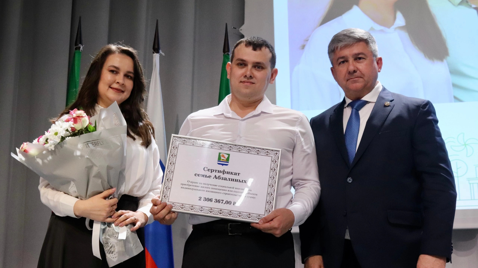 На торжественном награждении в ходе отчетной сессии глава муниципалитета Михаил Афанасьев вручил сертификаты семьям Хузиных и Абзалиных.
