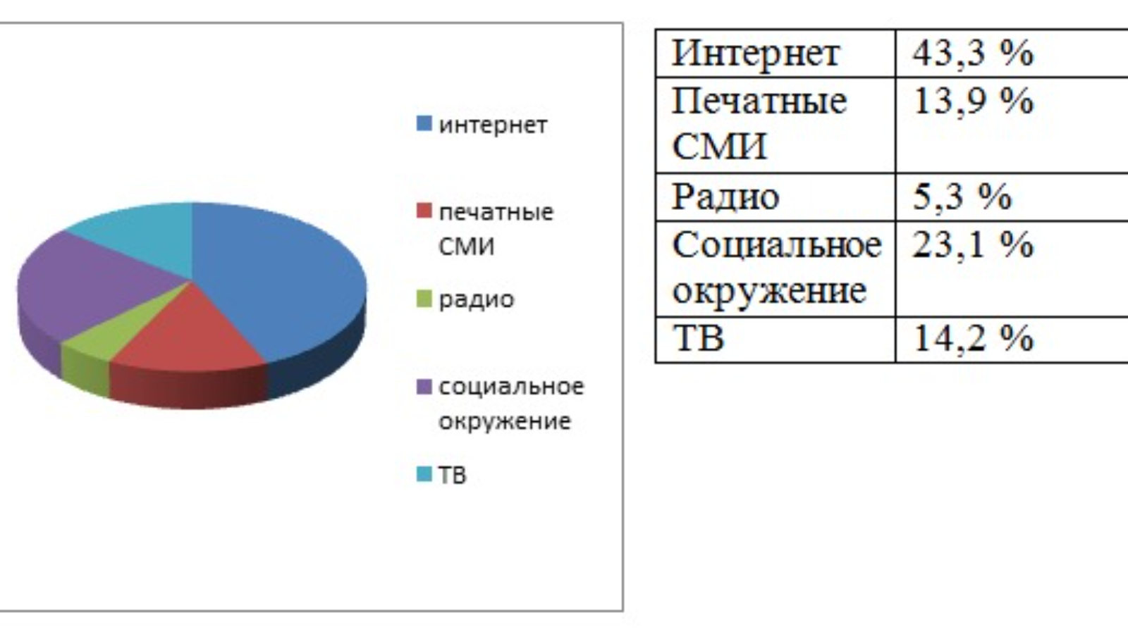 Результаты исследования показали, что интернет как источник информации для молодежи стал популярным, чем социальное окружение. Второе по значимости место занимает социальное окружение (родители, друзья, знакомые, соседи) — оно является приоритетным информационным ресурсом для 23,1% молодых людей. На третьем по значимости месте такой источник информации, как телевидение– 14,2 %. Радио и печатные СМИ (журналы, газеты) к сожалению, наименее востребованы участниками исследования. Доля молодежной аудитории, для которой значимым источником информации выступает радио, составила 5,3%. Размер аудитории, считающей печатные СМИ основным источником информации, в текущем исследовании составил 13,9%.