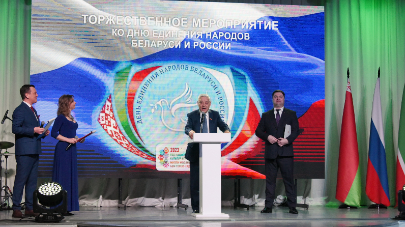 Сегодня в Доме дружбы народов состоялось торжественное мероприятие, приуроченное ко Дню единения народов Беларуси и России. От имени руководства республики гостей и участников мероприятия поприветствовал Председатель Государственного Совета, председатель Совета Ассамблеи народов Татарстана Фарид Мухаметшин.