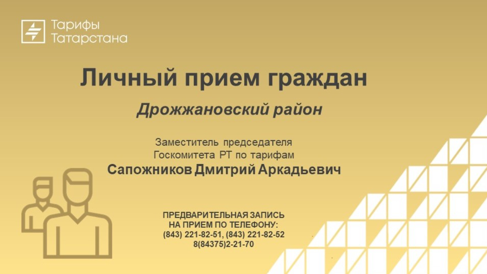 Успейте записаться на прием в Исполнительном комитете Дрожжановского муниципального района по телефону: 8 (84375) 2-21-70, а также в Госкомитете РТ по тарифам по телефонам: (843) 221-82-51, 221-82-52