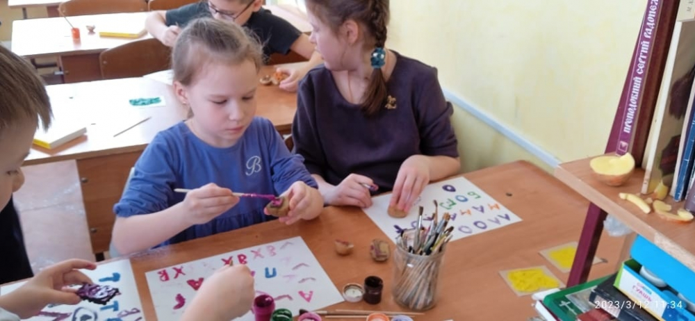 попробовали напечатать буквы и слова с помощью самодельных штампов. Воспитанники в рамках занятия узнали о главной книге православных христиан - Библии, познакомились с церковнославянским алфавитом и названием букв.