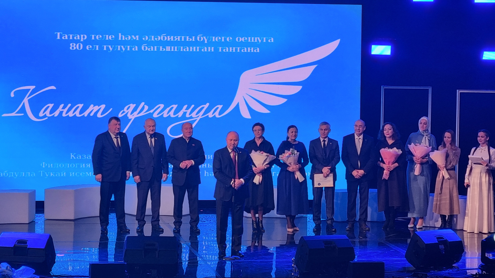 «Необыкновенная национальная среда. От имени Раиса Татарстана, Государственного Совета и Правительства республики поздравляю вас с этим праздником. Отделение носит короткое имя — татфак, но здесь делают большие дела. Выбирая судьбу, каждый из вас в душе был готов отдать жизнь за родной язык. 1944 год — год основания отделения татарского языка и литературы — был сложным для нашей страны, но забота о нации, о языке оставалась важной. Мы должны и сегодня брать пример. Спасибо вам за то, что стоите на страже языка», — сказал он.