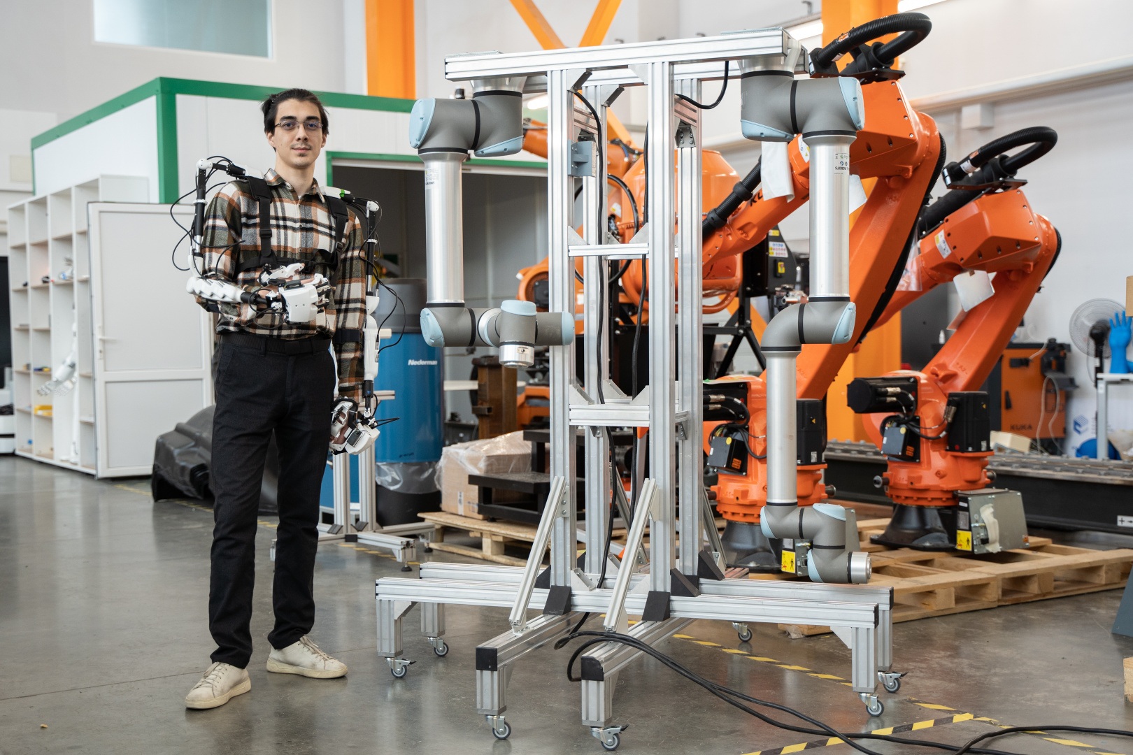 Руслан Даминдаров, лаборант Центра компетенций НТИ на базе Университета Иннополис: «В качестве управляющего устройства для оператора был выбран экзоскелет от компании Андроидная Техника. Мы спроектировали систему так, что экзоскелет можно связать с любым промышленным роботом при минимальных редактированиях параметров связи. А если у нас есть груз, который не может поднять один манипулятор, то можем задействовать двух роботов по принципу двух рук. Это как человеку легче поднять тяжелую коробку двумя руками, чем одной».