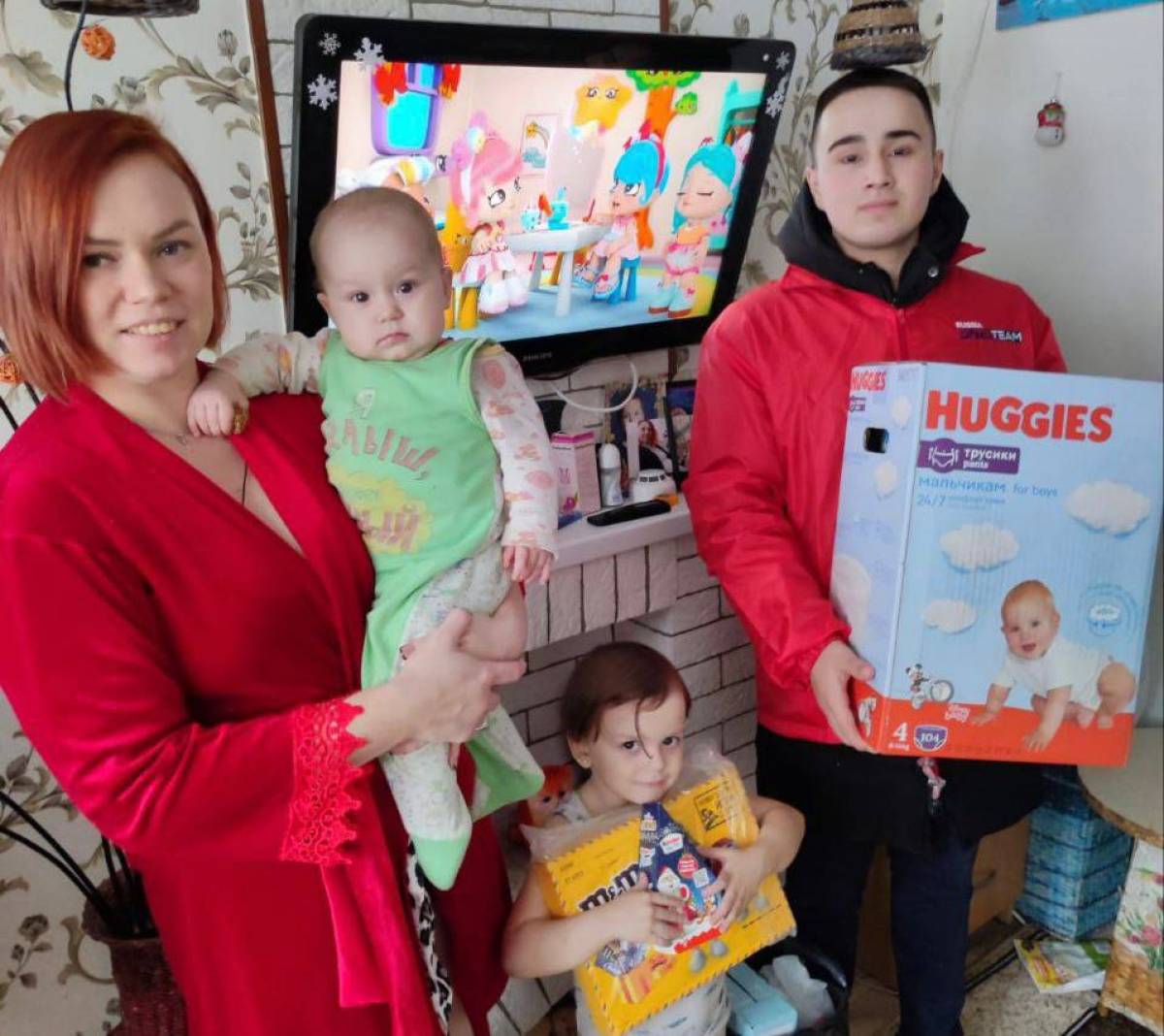 Молодогвардейцы вручили семье детское питание, предметы личной гигиены и небольшие сладкие подарки .