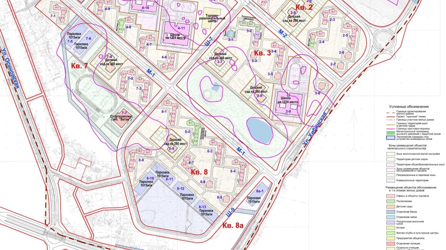 Согласно открытым источникам, в плане застройки отмечены области воронок. Среди них введенный в 2022 году в эксплуатацию парк за 500,5 млн рублей, а также детский сад №45 и школа №188.