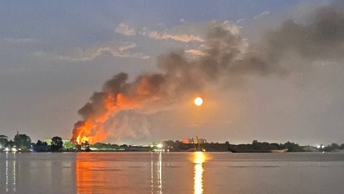 Ранее очевидцы сообщали , что дым от огня видно из разных районов города. На место прибыло около пяти пожарных машин и полиция. По словам очевидцев, огонь перекинулся на стоящие рядом склады.