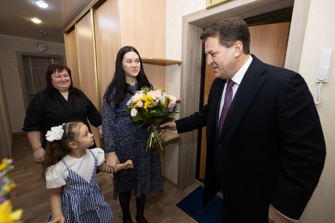 «В честь Международного женского дня решили приехать поздравить вас, вашу дружную и красивую семью. Папа сейчас защищает Родину. Алла бирса, в следующий праздник он сам вас поздравит», - обратился мэр к Алие и ее дочери.