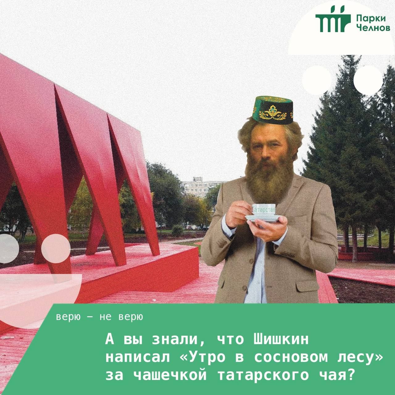 Так, например, челнинцам рассказали, что художник Шишкин написал знаменитую картину «Утро в сосновом лесу» за чашкой татарского чая, в парке «Прибрежном» обитает Шурале, а на берегу Камы однажды была замечена Су анасы.