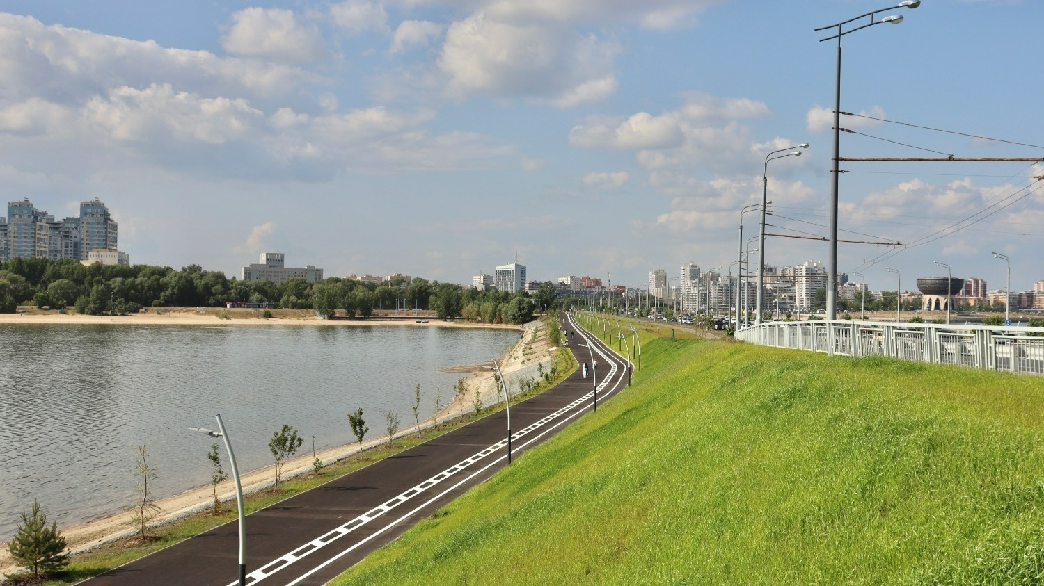 Здесь установили 26 скамеек и 45 парковок для велосипедов. Кроме того, при благоустройстве дорожки рабочие высадили 3,7 тысячи зеленых насаждений.