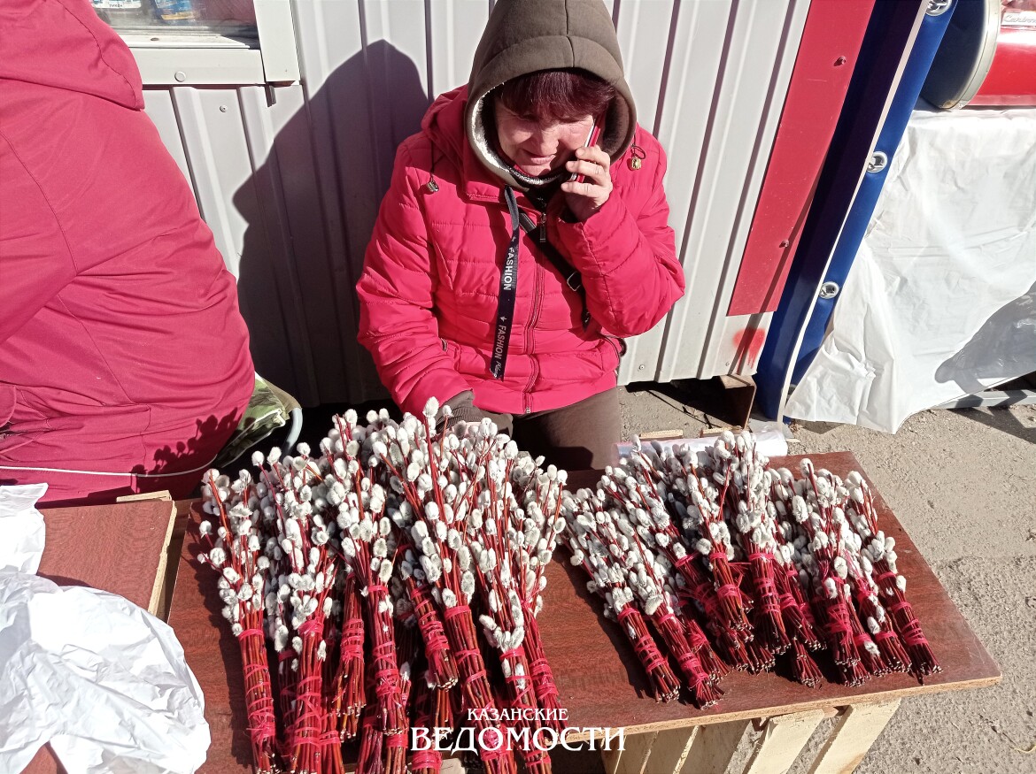 Казанцам нет необходимости самим отправляться к ивовым зарослям ( верба относится к семейству ивовых – Д.С. ), заветные веточки еще за неделю до праздника можно было приобрести без проблем. Пучочки разной величины в среднем от 50 до 150 рублей в зависимости от размера предлагают и на всевозможных рынках, и у станций метро, и просто не оживленных перекрестках. Торгуют в основном пожилые женщины. Как оказалось, все они приезжают с столицу Татарстана из соседней республики.
