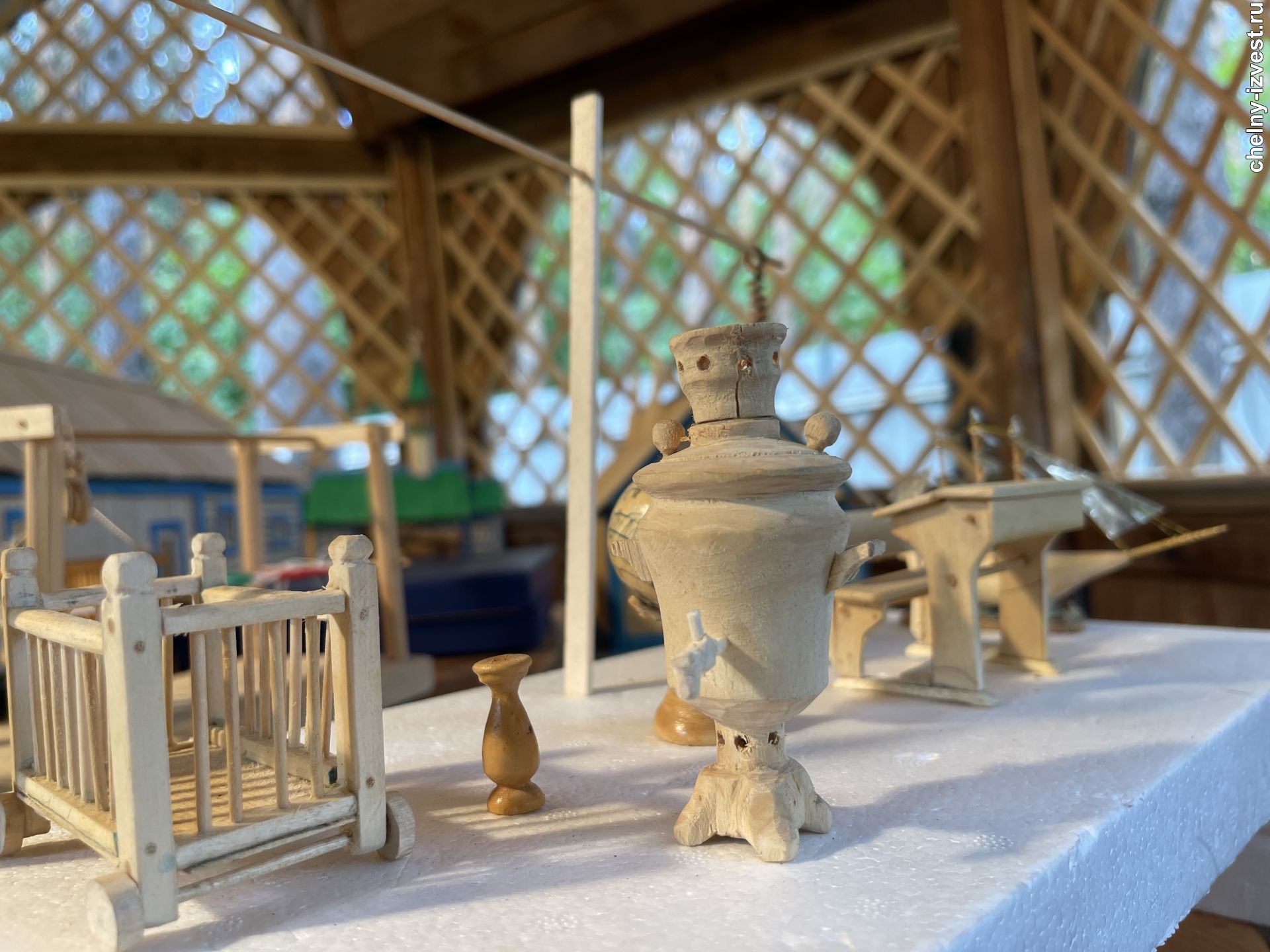 Мастер признается: тяжелее всего ему пришлось в создании уменьшенной копии родительского дома в селе Сабабаш Сабинского района. Его уже давно нет, и все нюансы пришлось воссоздавать по памяти. Получилось целое подворье, где есть не только дом, но и разные животные, фигурки людей, самовар, люлька для младенца, деревенский инвентарь – грабли, лопаты, вилы. Вся композиция – 15 на 45 см – может уместиться на подносе.