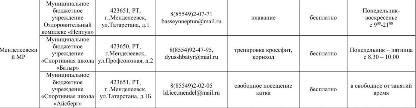 Реестр спортивных объектов, предоставляющих занятия по адаптивной физической культуре и спорту в Менделеевском районе, с указанием графика работы объекта и времени посещения.