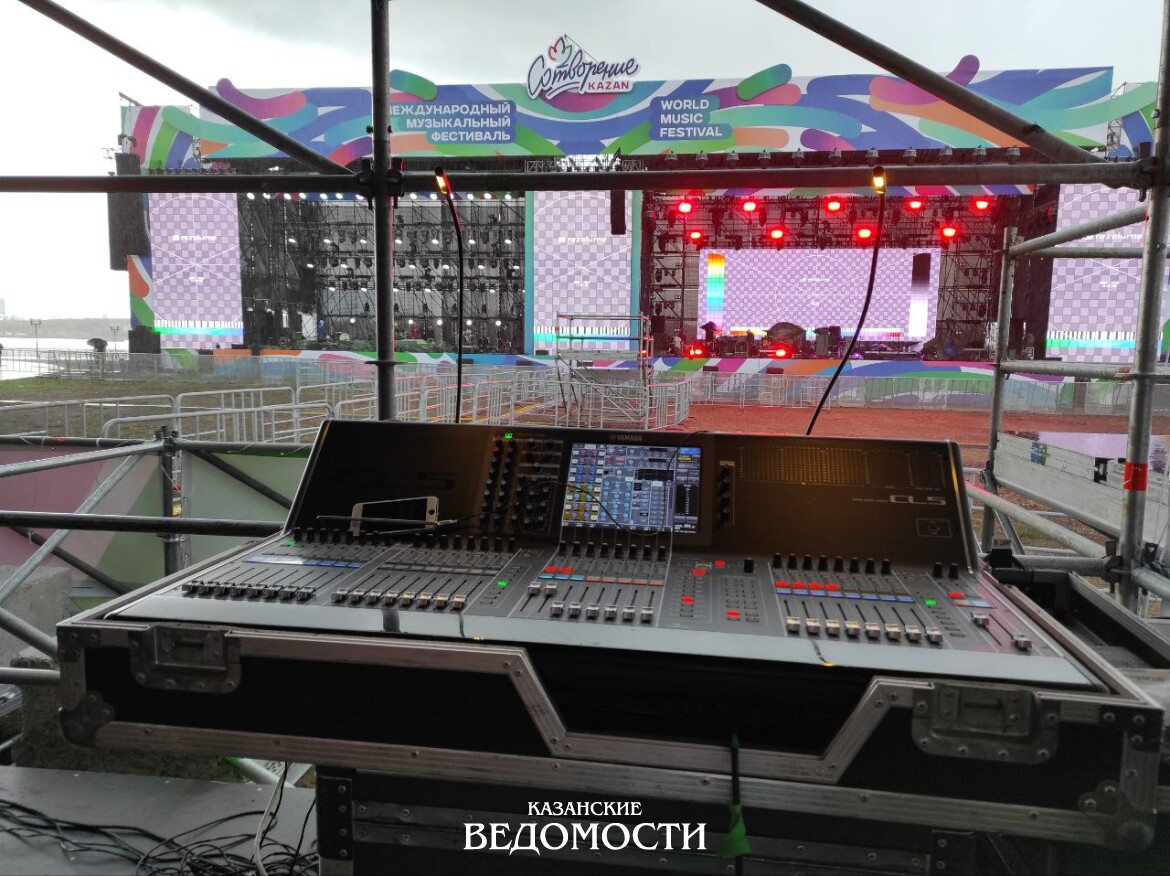 Сложная техническая конструкция у «Чаши» (Центра семьи «Казан») уже собрана. Для музыкантов подготовлены сразу две большие сцены. Пока на одной будет проходить выступление, над второй опустится занавес – там будет готовиться к выходу к зрителю следующий коллектив.