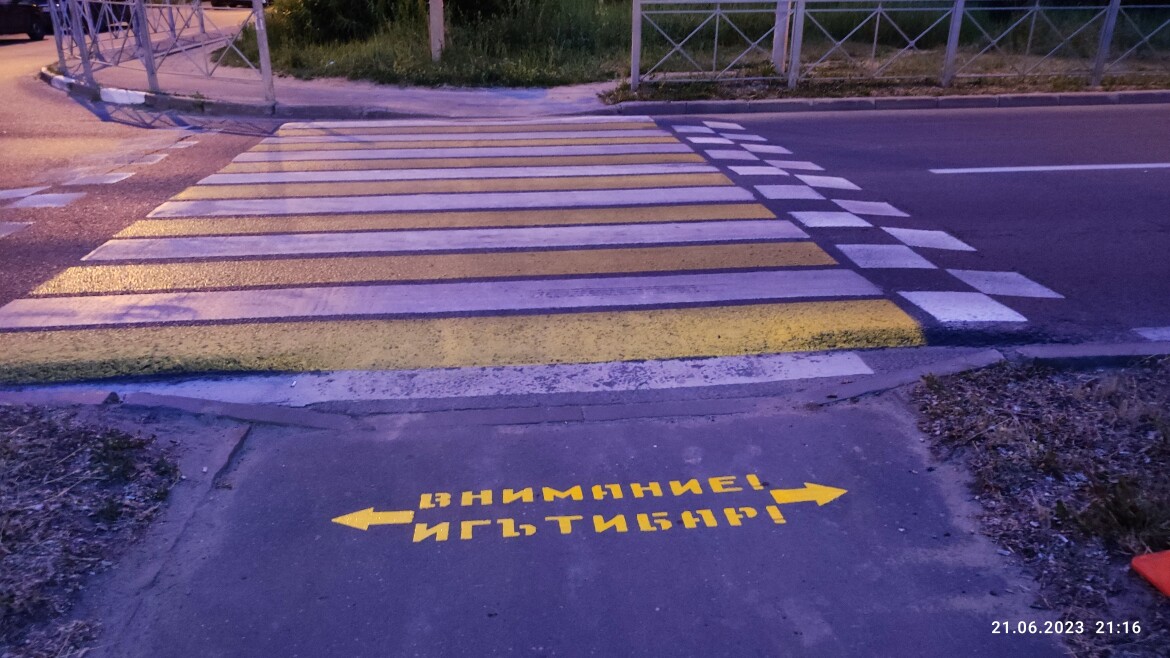В целях предупреждения ДТП с участием пешеходов и велосипедистов в Казани вблизи пешеходных переходов появились яркие и заметные надписи «ВНИМАНИЕ! ИГЪТИБАР!». Об этом рассказали в городской Госавтоинспекции.