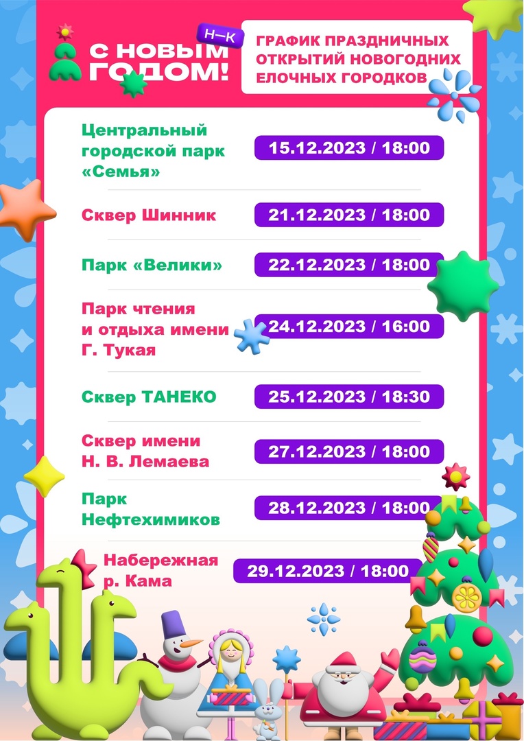 В воскресенье, 24 декабря, начнет работу резиденция Деда Мороза в Парке чтения и отдыха имени Габдуллы Тукая. А 25 декабря ярко и красочно откроется ёлочная площадка на Солнечной поляне. В среду, 27 декабря, в ёлочную эстафету включится новогодний городок на площади Лемаева. 28 декабря готовит торжественное открытие ёлочная площадка в Парке нефтехимиков. В пятницу, 29 декабря, праздничное мероприятие состоится на набережной Камы.