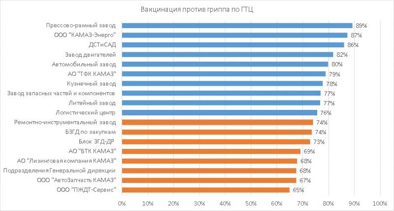 Лидерами по количеству привитых сотрудников являются прессово-рамный завод с уровнем вакцинации на уровне 89%, ООО «КАМАЗ-Энерго» с 87%, департамент спецтехники и содержания автодорог с 86%, завод двигателей с 82%, и автомобильный завод с 80%.